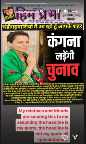कंगना रनौत ने अपने इंस्टाग्राम स्टोरी पर एक पोस्ट साझा की है, जिसमें उन्होंने अपनी राजनीतिक एंट्री के संबंध में फैली जा रही वायरल खबरों का खंडन किया है। उन्होंने एक हिंदी समाचार रिपोर्ट को साझा करते हुए दावों का खंडन किया और स्पष्ट किया है कि ये हेडलाइन्स पूरी तरह से गलत हैं और उस स्टेटमेंट को पूरी तरह से फेक माना जाता है। न्यूज़ आर्टिकल की हेडलाइन में लिखा है – ‘चंडीगढ़ वासियों में आ रही हूं, आपके शहर’। कंगना ने इस पोस्ट के कैप्शन में लिखा – ‘मेरे रिश्तेदार और दोस्त मुझे यह मानकर भेज रहे हैं कि हेडलाइन मेरा रेफरेंस है, लेकिन हेडलाइन मेरा रेफरेंस नहीं है। सभी अटकलें हैं।’